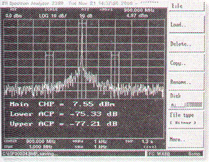 顯示的水平軸(頻率軸)中心頻率為900MHz,掃頻頻寬為1MHz,而每一小格代表l00kHz。頂部水平線表示0dBm,垂直方向每一格代表10dB。信號(hào)已經(jīng)被衰減了10dB,測量顯示的功率電平已考慮了此衰減。