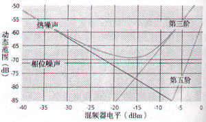 相鄰信道功率比(ACPR)或低電平IMD的測量要更困難,更需要注意頻譜分析儀的能力。圖2顯示了頻譜分析儀的熱噪聲、相位噪聲和第三、第五階交調(diào)失真與混頻器電平的關(guān)系。由于精確測量ACPR所需的動(dòng)態(tài)范圍接近或超出了很多頻譜分析儀的性能極限,所以必須全面考慮之后才有把握進(jìn)行正確測量。